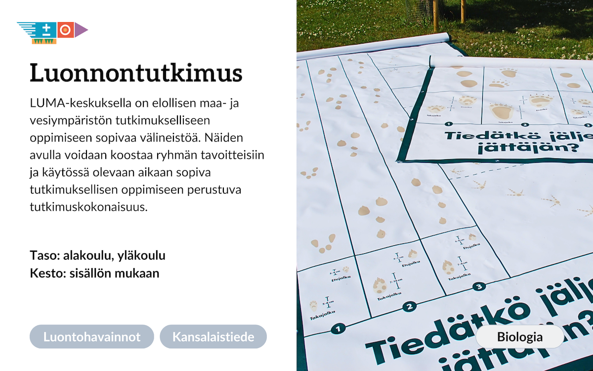 Ympäristötutkimukset toteutetaan maastossa, missä hyödynnetään tutkimuksellista oppimista sekä havainnointiin ja mittaamiseen soveltuvaa välineistöä. Maastotyöskentelyä voidaan täydentää jatkotyöskentelyllä koululla tai LUMA-keskuksen tiedeluokissa. Osa työpajoista on toteutettavissa myös oppilaitosvierailuna omassa luokassa - ota yhteyttä, jos haluat meidät kylään!