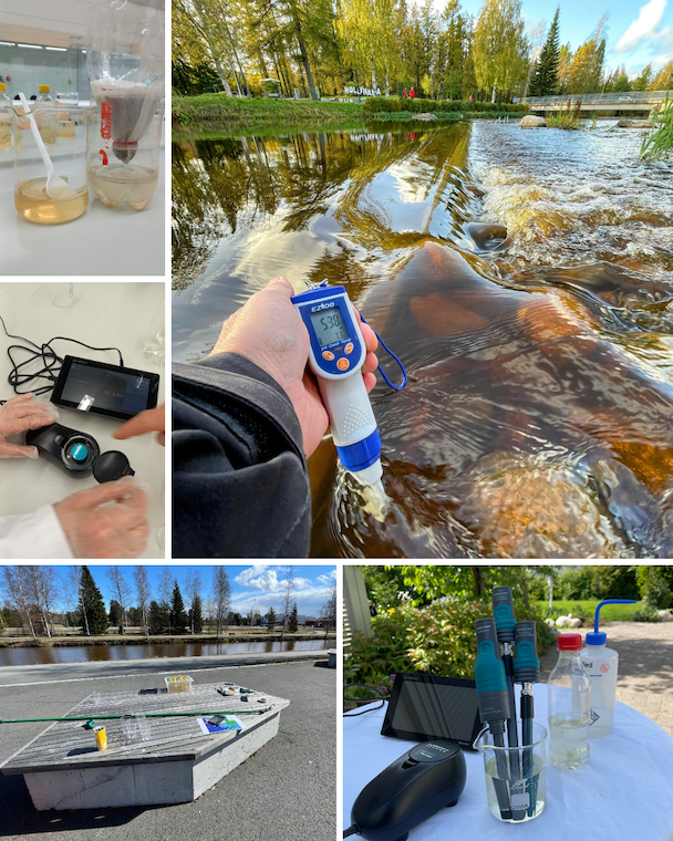 • Mitataan vesinäytteen sameus, johtokyky, happamuus ja nitraattitypen pitoisuus